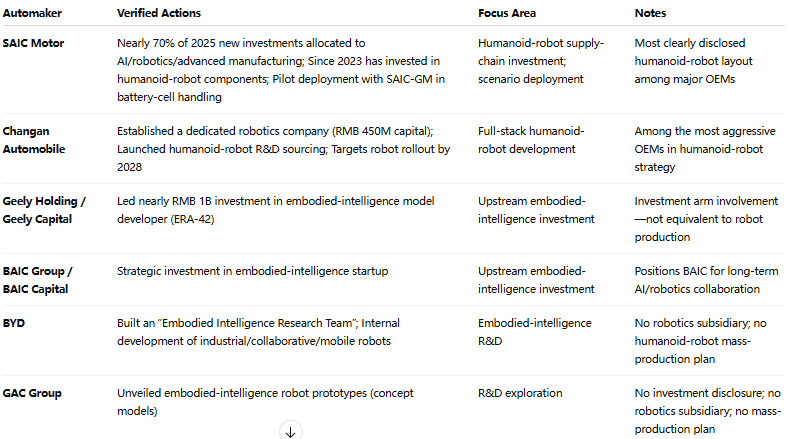 Chinese Automakers’ Humanoid-Robot / Embodied-Intelligence Activities (Non-Exhaustive)