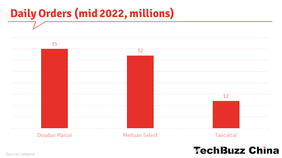 Together with Meituan Select and Duoduo Maicai, Taocaicai is considered one of the three new CGB players. In mid-2022, Taocaicai had 12 million daily orders, far behind Duoduo (35 million) and Meituan Select (32 million). [14]