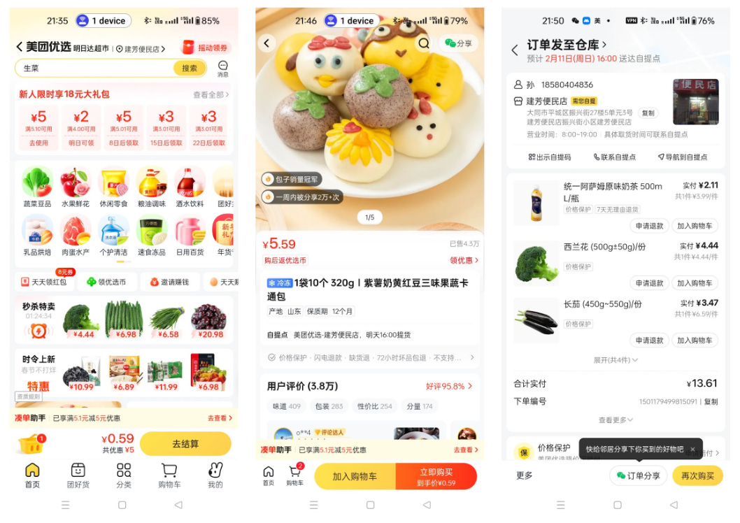 Meituan Select main page, product page and order confirmation with pick-up point.