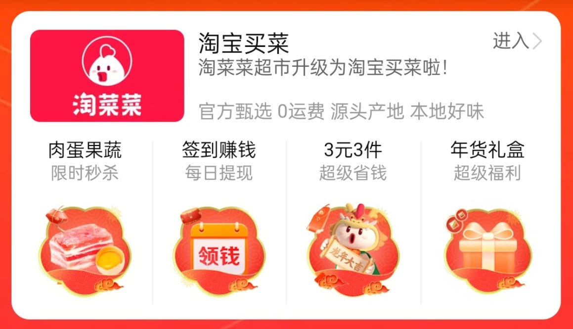 Message in the Taobao app that appears when searching for Taocaicao. “Taocaicai supermarket upgraded to Taobao Maicai".