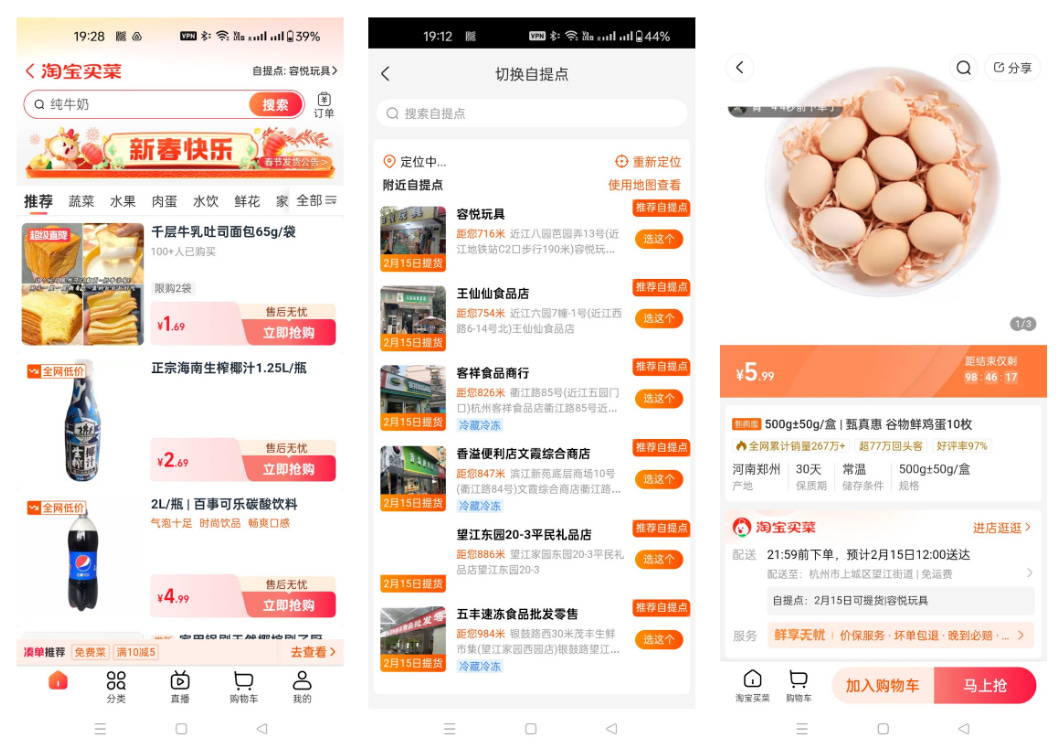 Left: Taobao Maicai main menu. Middle: Choose a pick-up point near you. Right: product page mentioning ‘Order placed before 21:59, delivered on 12:00'.