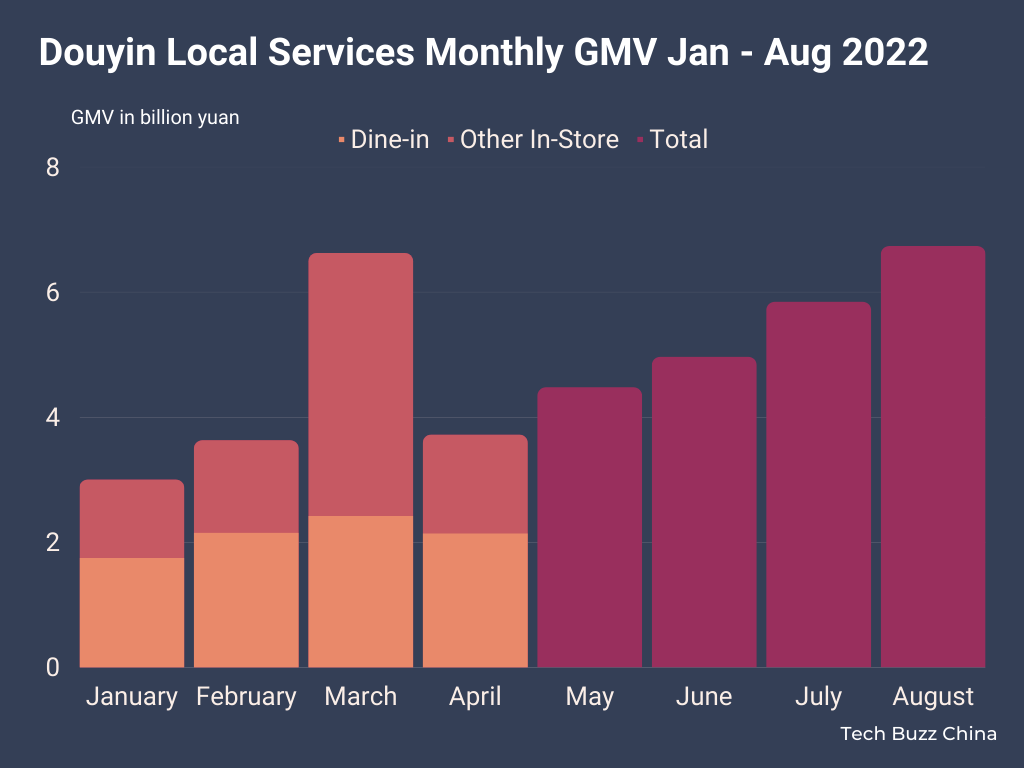 Dine-in has done well while in-store has been lackluster. Douyin's 2022 GMV targets were actually 50Bn yuan for local services, split into 60% or 30Bn yuan for in-store, and 20Bn yuan for dine-in. However, the actual GMV was 30Bn for dine-in and less for in-store. Whether or not that mix will shift now that the pandemic has ended is still unknown and something we will explore below.