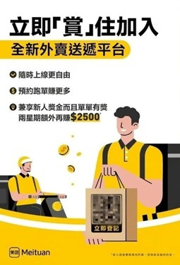 Join now on the brand new food delivery platform, Meituan! Go online anytime for greater freedom, schedule orders and earn more, plus newcomer bonuses and extra rewards on every order – earn an additional $2500 for two weeks! Register now! (Source: Linkshop)