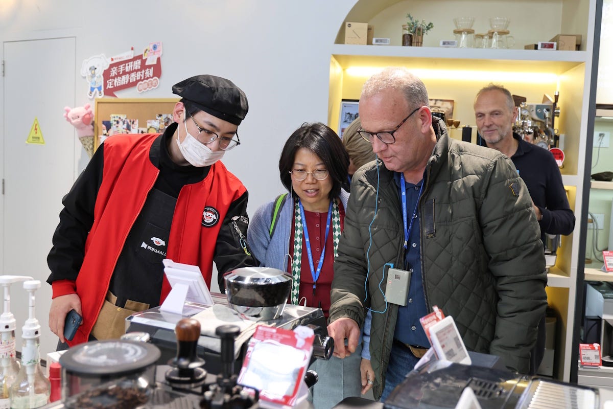 A participant of a ChinaTechTrip study tour is being instructed how to use the espresso machine.